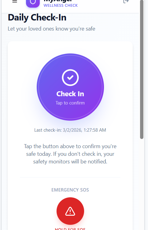 Myangel Keeps you instantly connected with your loved ones through effortless, safe check-ins! All of this is powered by our cutting-edge AI, which can even call 911 for you in case of an emergency! Plus, with the optional GPS tracking, you'll always know exactly where they are! 🌟
